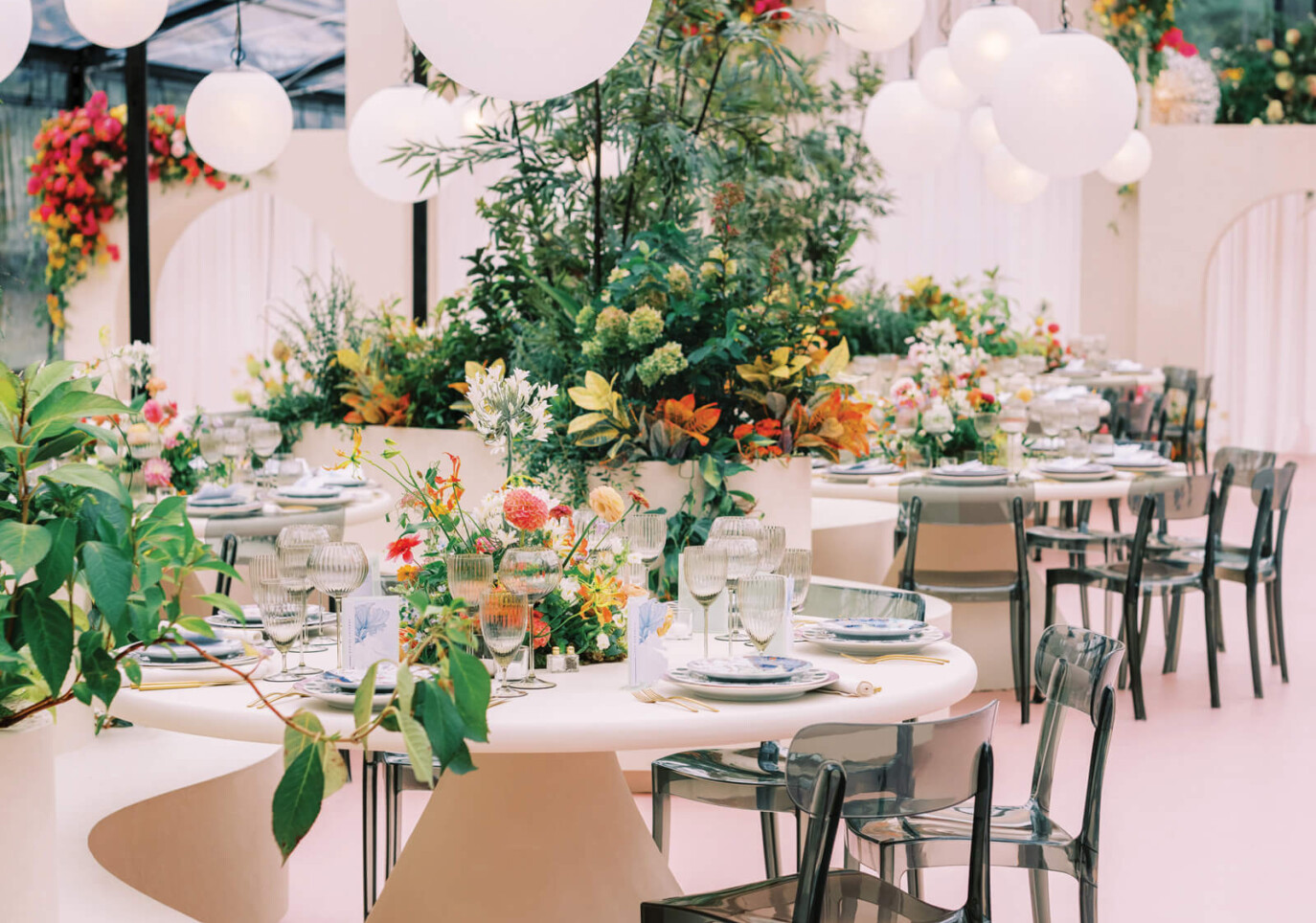 Dreamy florals, orange place cards, pops of color, and tons of personality.