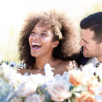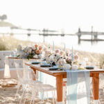 “There’s no better place for a romantic elopement than on the water. House of Redman’s floral combination of blue thistle and delphinium really popped and complemented our color palette. Every detail in this shoot mattered from Elite Secrets’ lace off the shoulder boho gown (which in my opinion is perfect for the beachy bride), Steph G Callig’s geometric shaped place cards, Honeywood Rentals perfect farmhouse tables and beige love seat, Kim George’s sweet leather jacket that read “Happily Ever After” and, of course, All In The Mix’s over the top cake. Beauty by Jacs and Amanda Merrell Beauty gave our model Ally a very natural look which was soft and glowy with her gorgeous natural hair style. We are so grateful for all of the creatives that participated in bringing this dreamy beach shoot to Maryland.” – Jessica J. from Jessica J Events