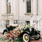Galia Lahav “G-302” sheer lace mermaid dress with an inner corset and shoulder straps adorned with embroidered lace appliques ($7,360) and long veil edged in lace by Estee Couture ($675) at Francesca’s Bridal. Bouquet and floral installation from Victoria Clausen Floral Events. 1930 Ford Model A Roadster on loan from Andrew and Emily Reymer, members of the Greater Baltimore Model A Ford Club.