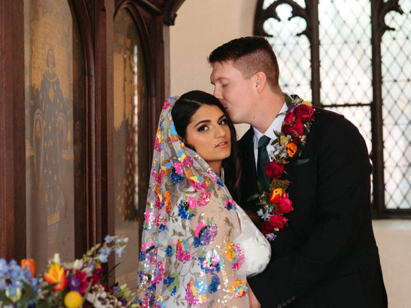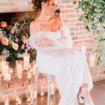 “For this shoot we wanted to bring pastel blooms inside Camp Hidden Valley. This venue is a hidden gem and exudes romance and whimsy. The fragrant stock, ruffled lisianthus, soft blue delphinium, and whimsical greenery cascade from the floating arch, created a charming canopy. The mossy tablescape reminds you of a magical forest. All the details from the table settings to the flickering candlelight against the warm stone fireplace produce the most enchanted setting. The chemistry from our models added the final touches of intimacy we were going for.” – Rebekah Barnes, Lyn Leland Photography