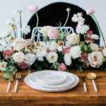 “There are so many things that remind of us spring—pastel colors, blossoming flowers, blue skies. After months of winter and impatiently waiting for the seasons to change, there are certain hints that let us know spring days are around the corner. For me, this was the butterfly. A butterfly represents a transformation, a change—we really focused on bringing these springtime elements throughout the design in terms of pops of bright butterflies, pastel colors in our Something Vintage glassware and flatware, inspiring custom-designed chargers from Mozaiko, and natural wood elements with the tie-dyed farm table from Honeywood Rentals. Mixing the natural elements with the hairpin chairs was an unexpected design piece that gave a modern feel to the overall look of the space. In the blank canvas of a white room that highlights beautiful architectural design, we didn’t want to take away from the venue, but rather enhance it with complimentary details. From the delicate Bhldn gown and draped lace cape, to the incredible cherry blossoms that are in peak season only a very few weeks per year, not a detail was spared in bringing this springtime glow from the outside, in.” – Elizabeth McConeghey at Elizabeth M Photography