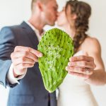 “Ever since I visited Arizona two years ago, I have been obsessed with cacti. I don’t know what it is about them, but they are just so fun and unique to me. My cactus craze was the biggest piece of inspiration for this shoot. I wanted it to be fun and unique, and it was just that. We had colorful florals, signs and drink menus on actual cacti, and a seating chart with tequila shots. But best of all, we had a surprise guest appearance from Chester, the service dog. Our amazing models, Dennis and Liz, brought their in-training service dog, Chester. He lightened the mood to make the day even more fun, and it just so happened to be a wonderful coincidence that he matched all of our copper accents.” – Emily Brianne