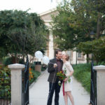 Florals from Eventi by Diana Venditto. On her: Vienna shift dress from BHLDN. On him: Stylist’s own. “We Eloped!” balloon from mlc designs. Shot on location at the original Towson courthouse, the Creative Alliance’s BUS stop designed by Madrid-based artist collective mmmm…, and at the city home of RC and Erin Reed.