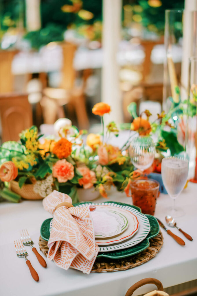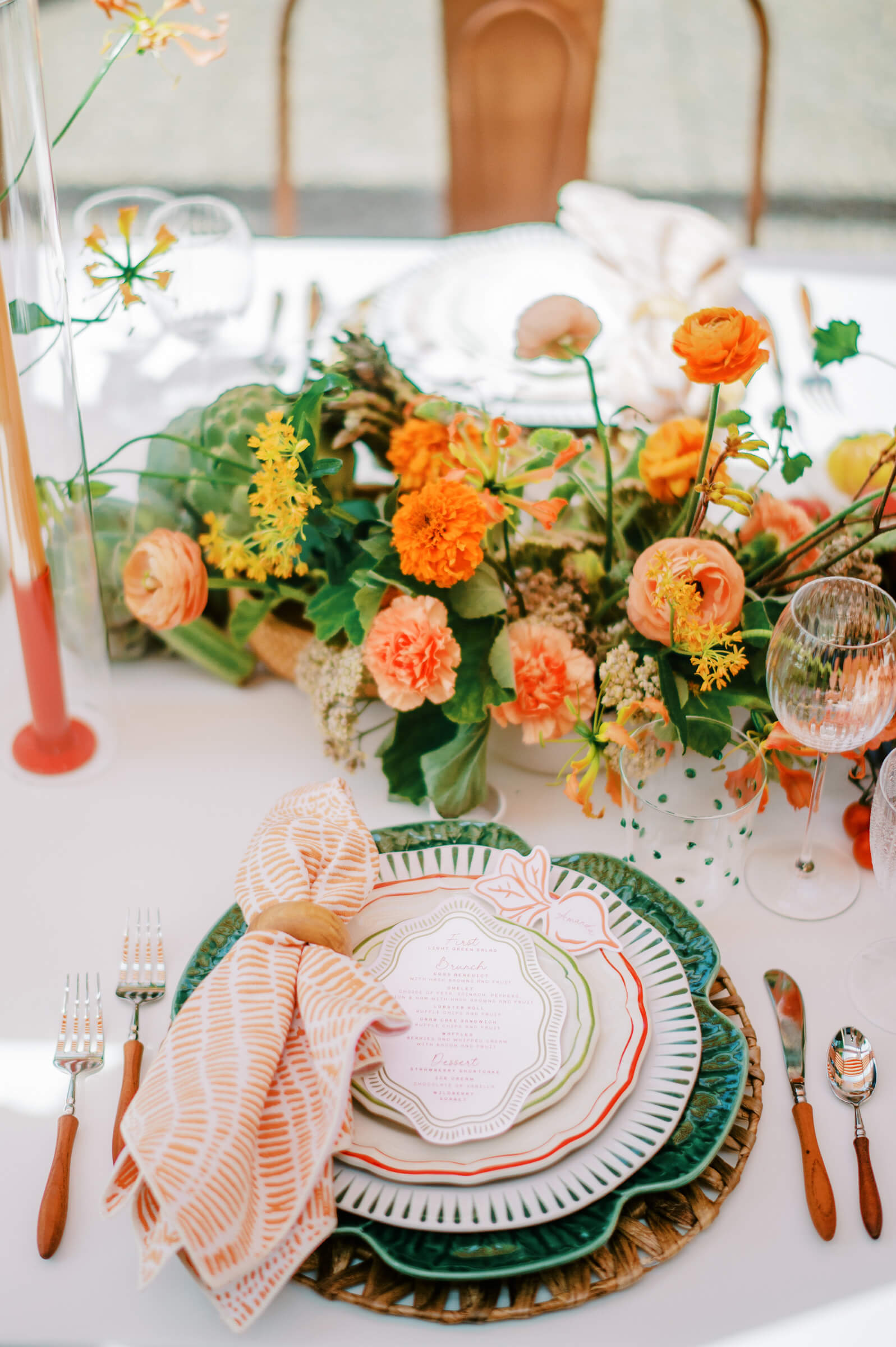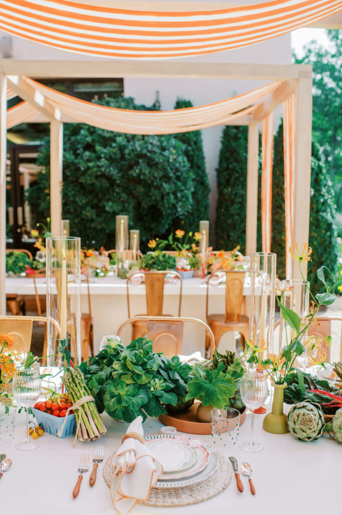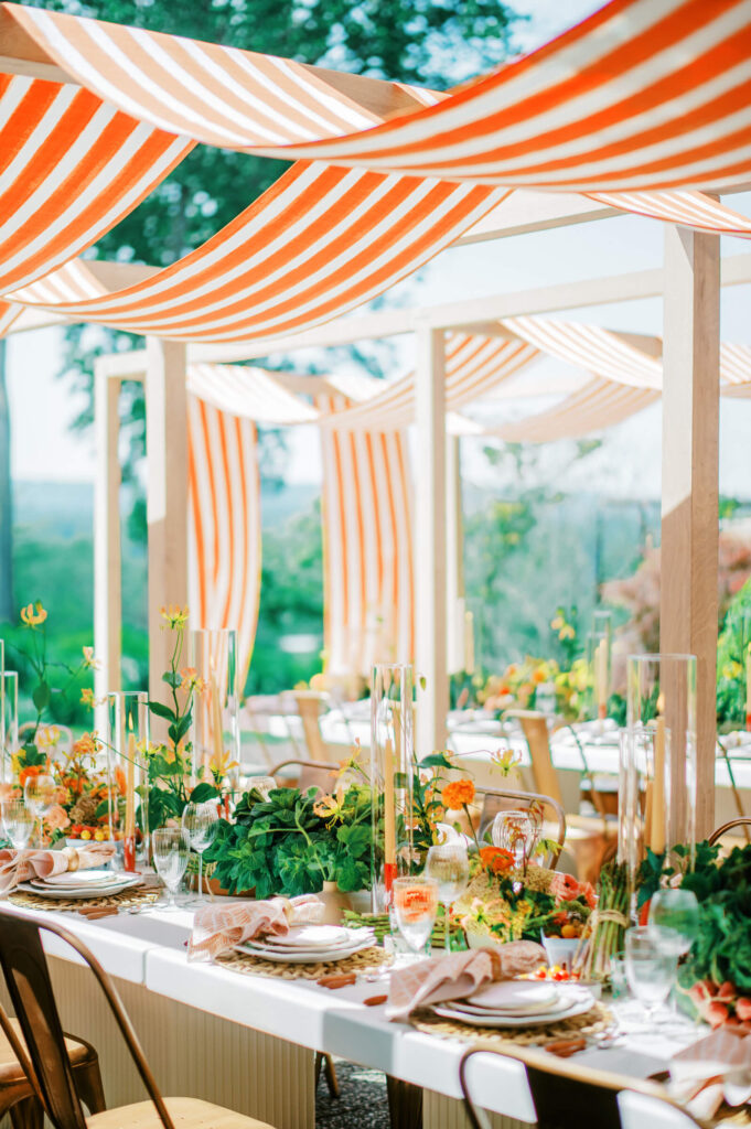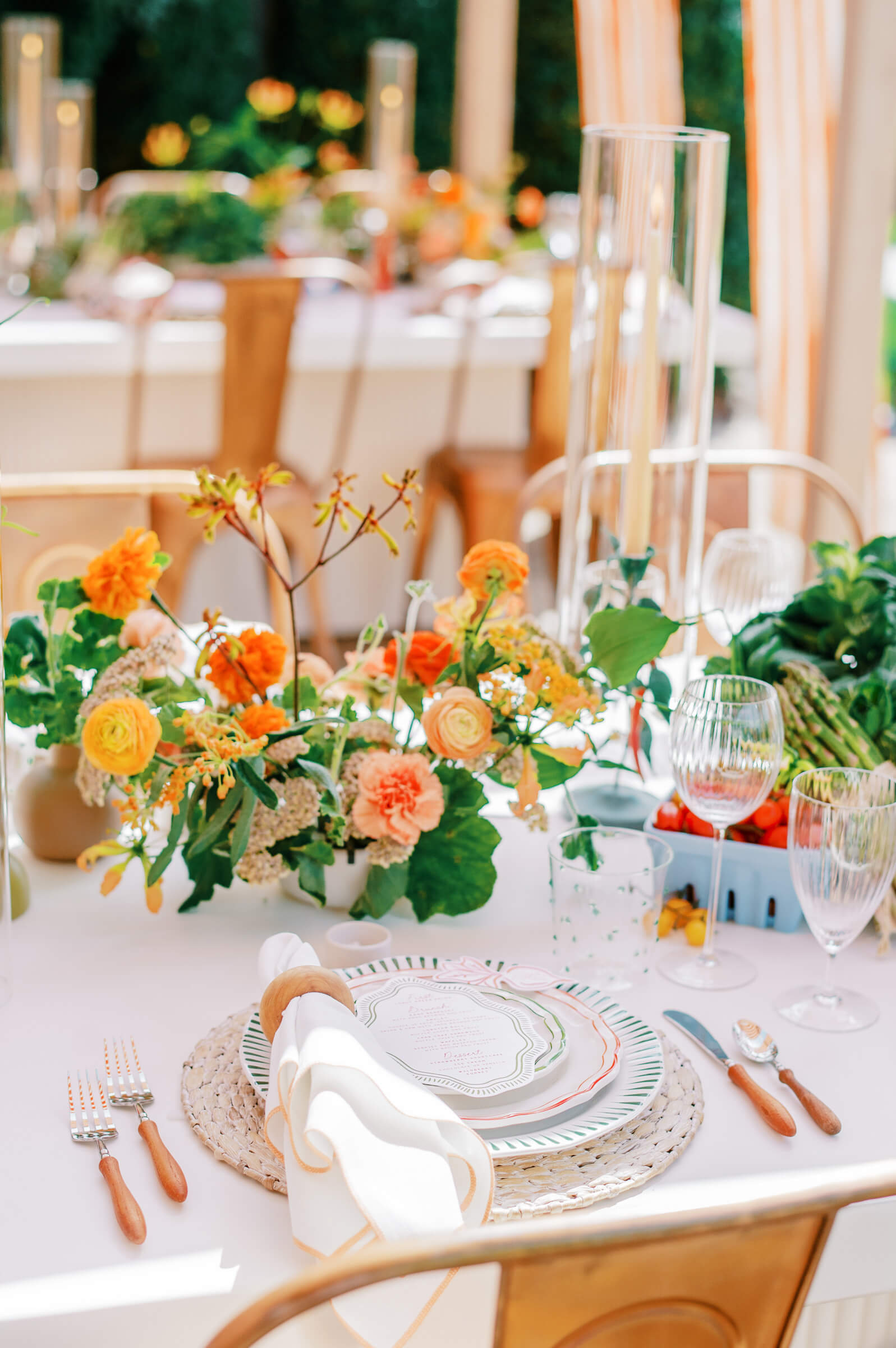 Set against the lush greens of the golf course, we wanted to embrace a fresh palette while keeping things unexpected. We knew we needed something that popped—enter orange. The canopy had been green all along, but a few weeks before the shower, we decided to switch it to orange and it was the best decision.
