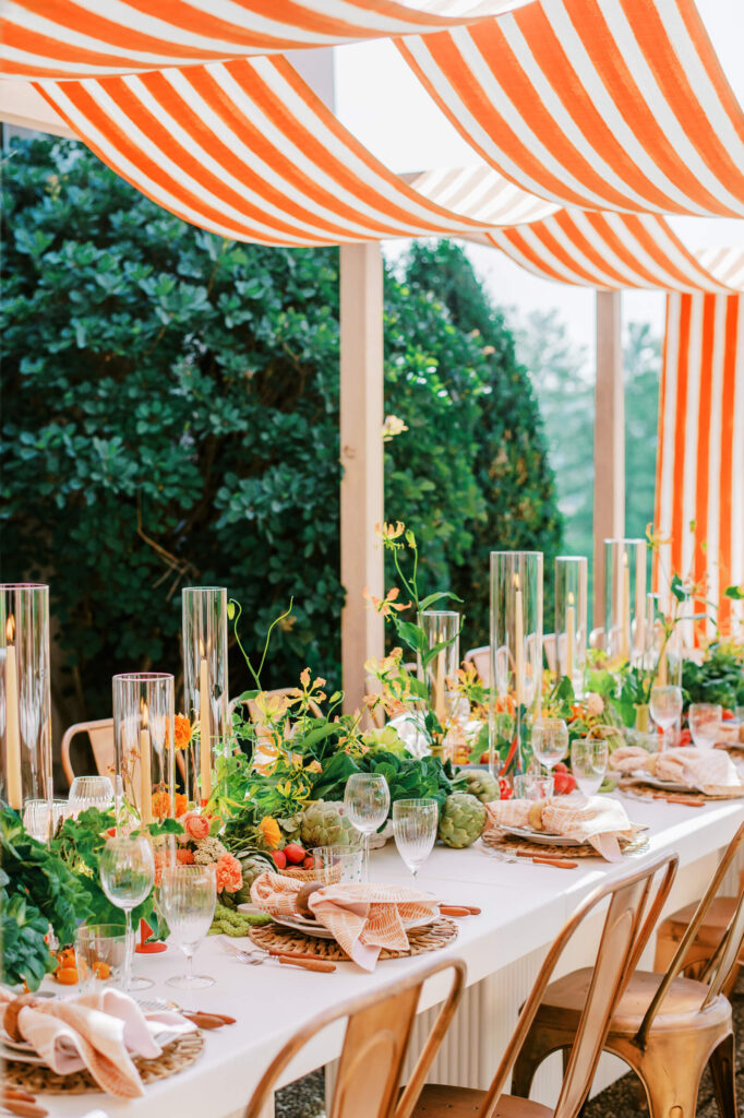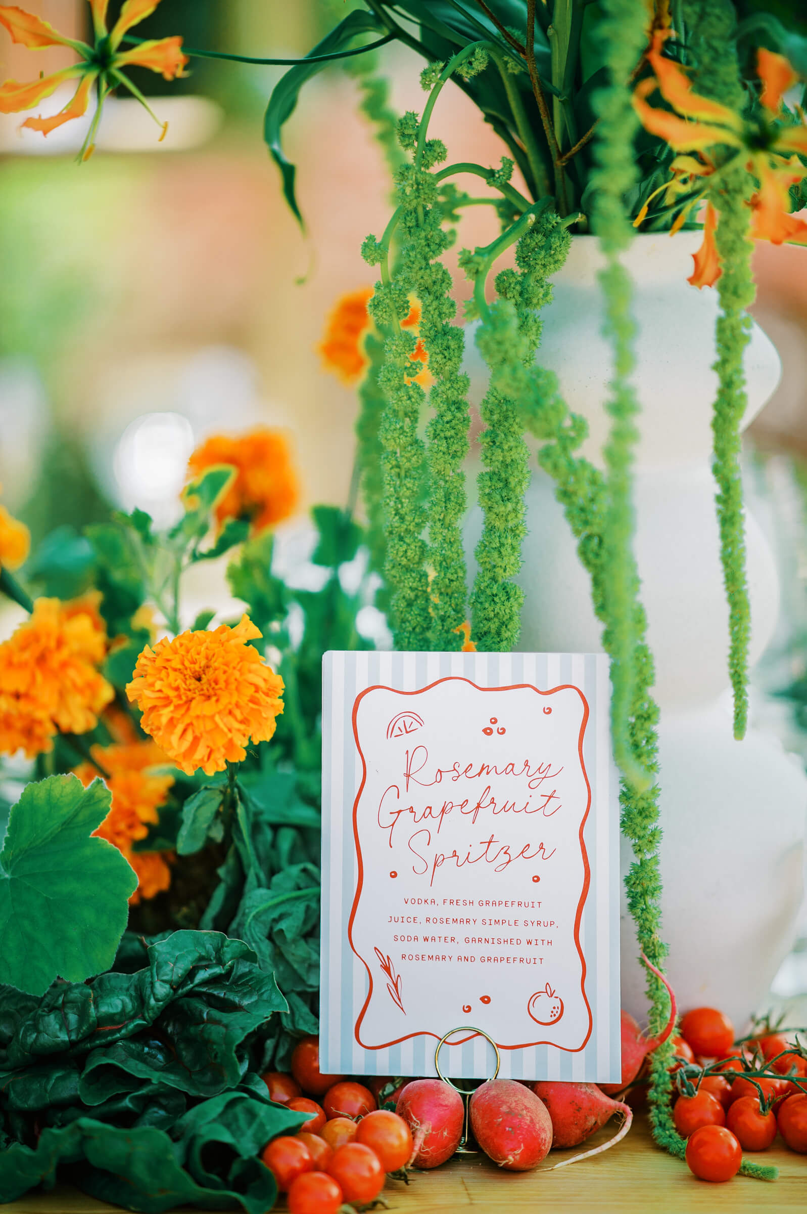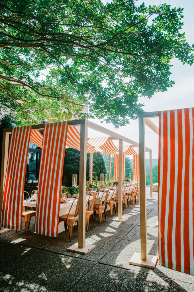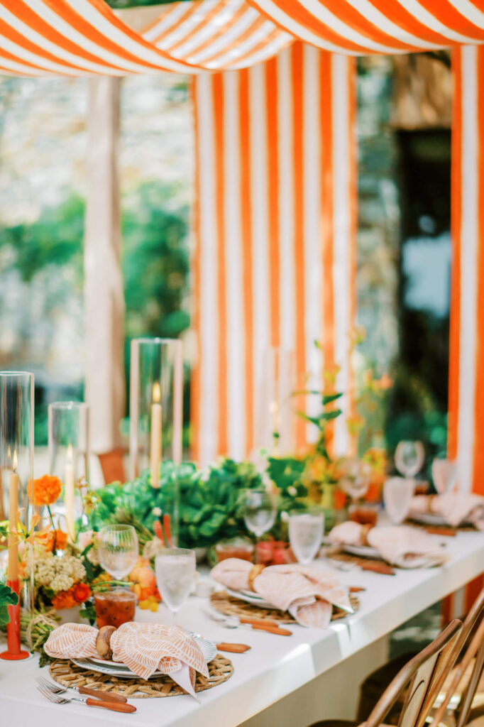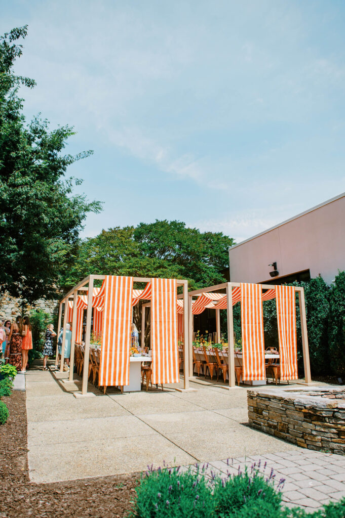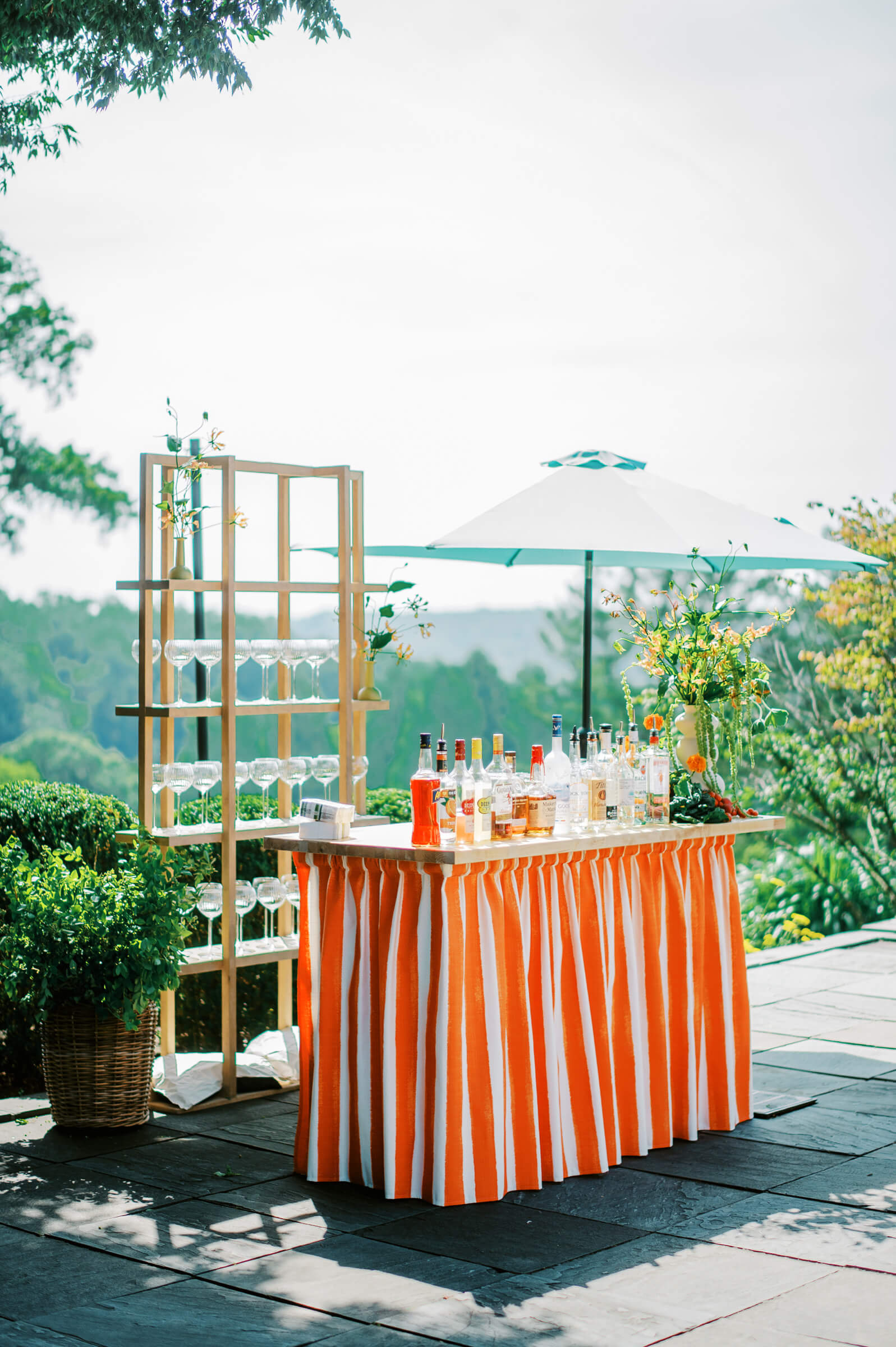 Set against the lush greens of the golf course, we wanted to embrace a fresh palette while keeping things unexpected. We knew we needed something that popped—enter orange. The canopy had been green all along, but a few weeks before the shower, we decided to switch it to orange and it was the best decision.