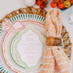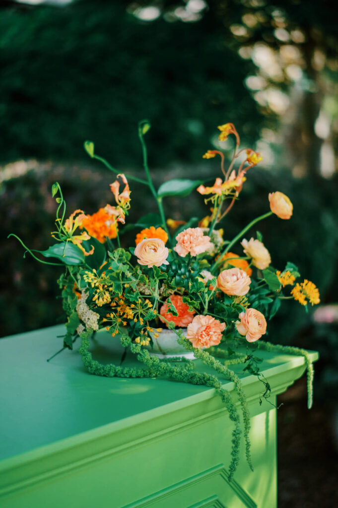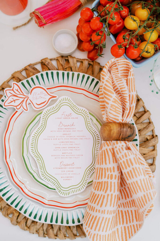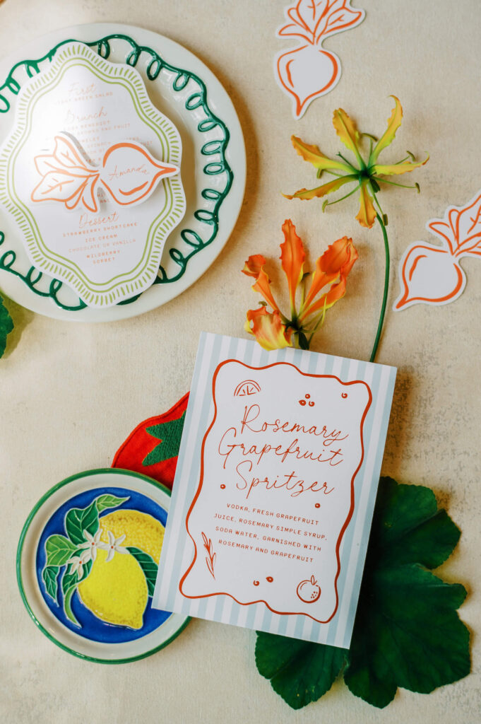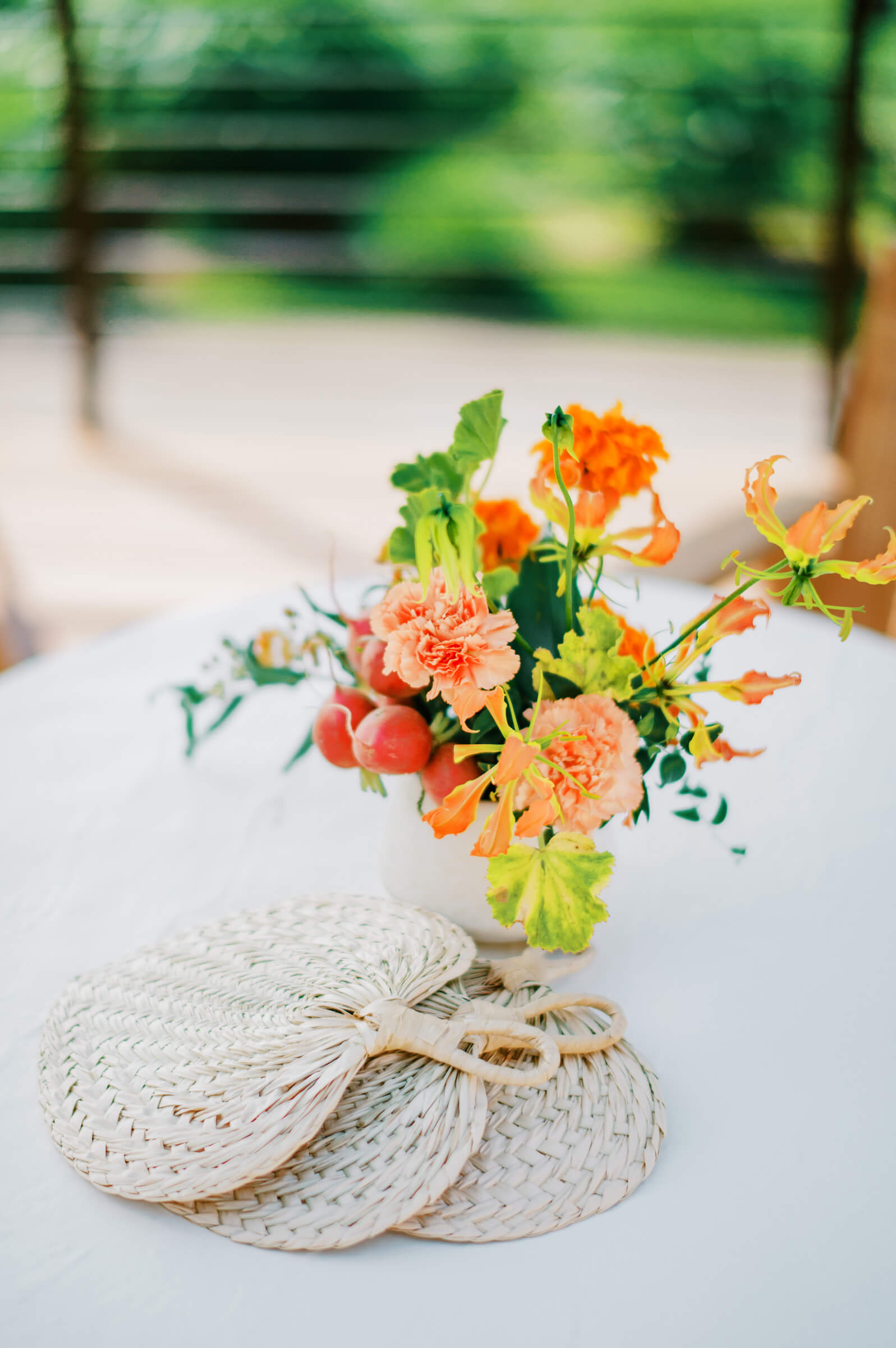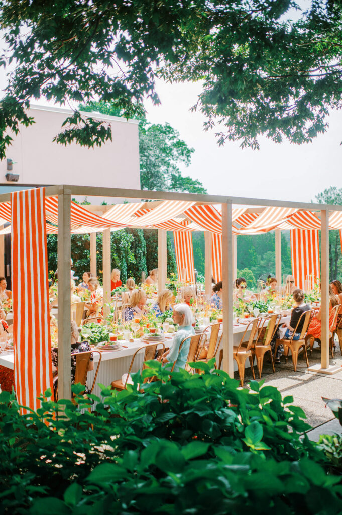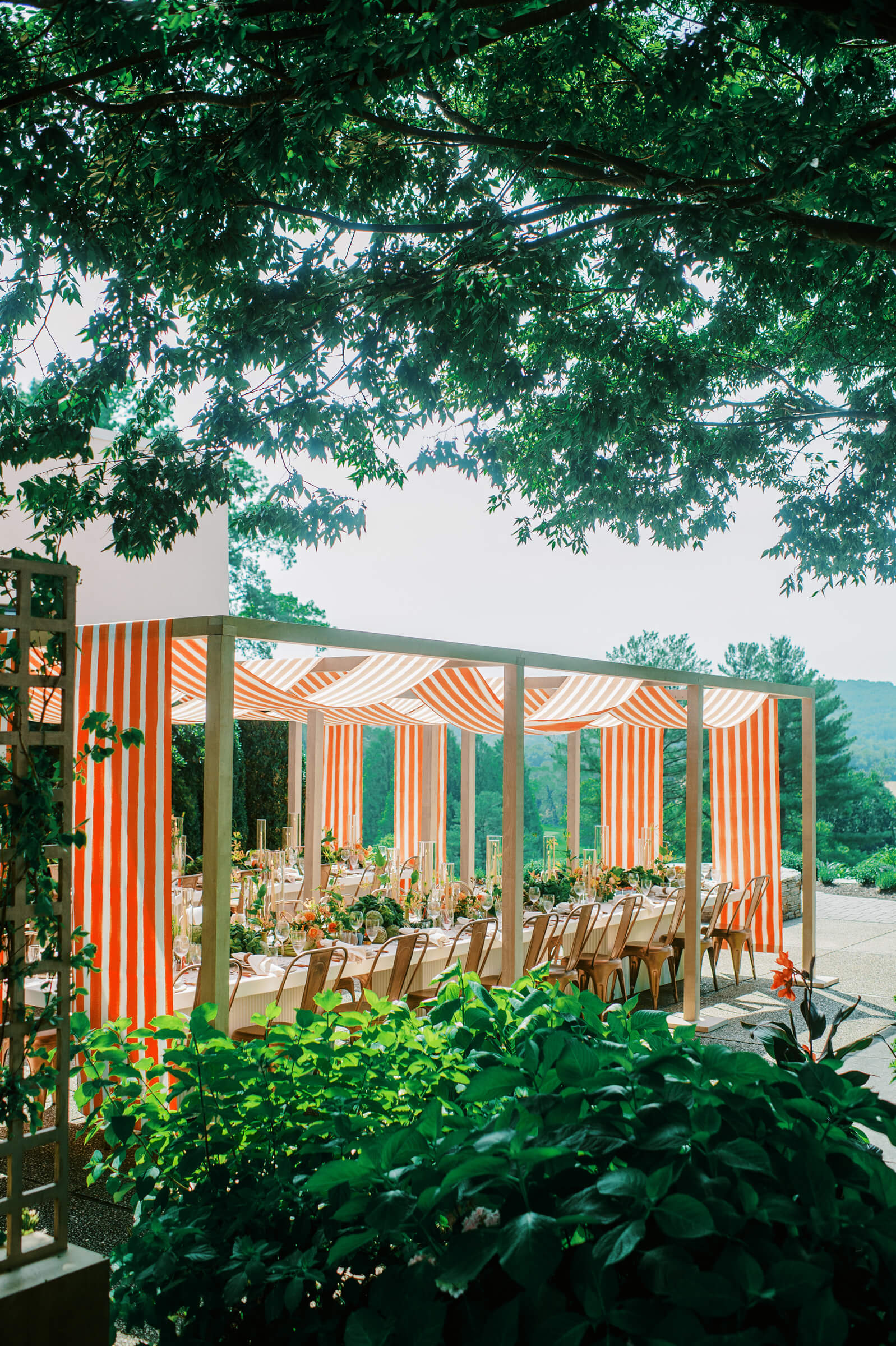 Set against the lush greens of the golf course, we wanted to embrace a fresh palette while keeping things unexpected. We knew we needed something that popped—enter orange. The canopy had been green all along, but a few weeks before the shower, we decided to switch it to orange and it was the best decision.