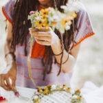 DIY activities provided by Make Tribe. Flower crowns and buds provided by Butterbee Farm and Local Color Flowers, special thanks to Irene Donnelley. Honey ($15 per jar) at Ladybird Farm. Dried herbs and wildflowers ($10 per bundle) at Butterbee Farm. White Glove Rentals: Zane Moroccan side table, coiled basket, pink rug, natural antlers, Aziza Moroccan table, copper lanterns, pink kilim pillow, Iman and Mina poufs, glass medicine bottles, and pink milk glass. Trohv: Dash tea towel ($22), The Cartographer Pillow ($176), Ilse throw ($120), pink glass pastel picnic lanterns ($58), Paploma bud vase ($12.50), moth and snake clipboards ($26.50), Ciara fruit bowl ($11), yellow bandana napkins ($20), rose gold scissors ($22), Demijohn bowl ($20). Antique Exchange: blue striped large pillow ($65) and apothecary candle ($24). In Watermelon Sugar: coiled small baskets ($20) and extra-small baskets ($14), Neroli candle ($12). Curiosity: matches ($28-34) and teak spoons ($23/set of four). Crystals and Cauldrons: incense packet ($12.95) and crystals ($5-25).