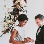 “This design is for the modern couple who wants their wedding to have personality and a bit of edge, but to still exude romance and elegance. The palette combines modern black and gold with natural elements including foraged branches and textures, plus hints of maroon and forest green. This look would capture the attention of party guests making them feel as though they were part of a modern and minimal enchanted forest-scape. Hosted at Habitat, this shoot included a local lineup of vendors who poured their creativity into the vision creating custom elements that all came together to achieve the overall effect. Celebrating their personalities this couple wanted to share their love for music by highlighting one of their favorite quotes from Led Zeppelin, all the while sipping on their signature ‘Key City’ drink crafted by the local Tenth Ward Distilling.” – Rachel Cumberland