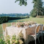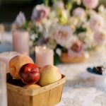 The bridal bouquet weaved together dahlias, lisianthus, garden roses, and hydrangeas in a palette of a soft summer sunset, fastened with trailing silk ribbons. And adorned with an array of delicate flowers, plump peaches, and succulent cherries, the tablescape highlighted the region’s bounty from local farms. The hydrangeas serve as the base of the floral arrangements letting the dahlias, roses, and phlox shine.