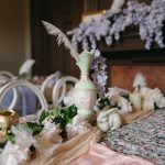 The dreamy Cylburn Mansion is a wedding venue nestled in the middle of a gorgeous arboretum. The mansion’s front room looks like it came straight from a movie. I sourced silk florals, vintage porcelain figurines, busts, vintage tablecloths, and lots of feathers to bring the vision to life. I was also able to incorporate sentimental touches including a beautiful portrait of my late grandmother, Eileen, many of her collectibles; and the cake table; which has been passed down in my family for generations. My baker made an eggless cake and two traditional cakes to bring the theme to life.