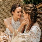 “Elopements are all about the small moments, the casual laughs, the simple elegance of two souls joining. When I set out to style this shoot, I wanted to focus on the tiny details that build a larger picture. I wanted to create a carefree moment that would inspire others. We decided to go with shorter dresses, boots for hiking in the woods, simple gold wedding bands, and dried florals. I think the best way to celebrate love is whatever feels authentic to you—and if that’s popping champagne in the woods, throwing your hair in braids, and cuddling up on a vintage rattan chair—then do what makes you happy.” – Sarah Middleton