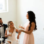 “The inspiration for this styled wedding was to incorporate as much bold, moody, contrast-y colors and texture with a little pop of brightness here and there. I wanted to create a wedding that wasn’t matchy-matchy, even though those weddings with every little detail coordinated and choreographed are gorgeous, it honestly just doesn’t always feel like real life and comes across a little stiff. Weddings should be fun and should show off personality. This styled wedding is everything that I dream of for my business’s brand and aesthetic. I worked with a group of incredible vendors who took my loosely put-together vision and brought it to life. The Flower Shop KI created a bouquet that had dark and moody tones but with so many different styles of flowers, it had a huge element of texture. (I even separated and dried the bouquet and it makes for a beautiful delicate piece to I am still using as décor.) Pretty Little Wedding Co. created a tablescape with black and white geometric patterns, simple goblets, and gold and black dipped silverware on top of Honeywood Farm Table Rentals gorgeous wooden table with the white dipped legs and geometric metal chairs. Your Adventure Designs created the menu, invitation suite, and place cards in gold with a white background and smoky burnt (actually burnt!) edges. Annapolis Bridal dressed our bride Ashley in a simple white lace gown, a feminine pale pink gown for the maid of honor, Alexa, and the groom, Nolie, and best man, Frank, in deep blues and grays with hints of maroon. Their looks were pulled together by Maskcara Faces by Chelsea and Pins and Curls Hair Artistry. So, not only was this a romantic set-up for a faux wedding, the best man model reached out to me a week or so prior to the date and asked if he could use the end of our styled wedding as the proposal to his girlfriend (the maid of honor model.) The bride and groom are her brother and sister-in-law, so it was already a family affair and who better to have as witness to your proposal than your best friends? Of course, it went absolutely perfectly, and our mock wedding ended with a real-life engagement!” – Sara Thomas, Willow Roots Photography