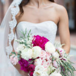 For rentals, we selected a textured linen from La Tavola and paired this with the timeless designs of Anna Weatherly china as well as etched glasses and vintage French chairs from DC Rental. There is an understated elegance to the tablescape which worked perfectly with the ornate details of the dress. We incorporated beautiful bold colored flowers from Intrigue Design and Decor into the centerpiece and matched these with paper goods from Allison Barnhill Designs.