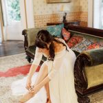 “It’s easy to get swept up in the craziness of your wedding day, but remember to slow down, take it all in, and have fun,” says Ethan. Even the rain helped create a cozy atmosphere for the 100 guests in the carriage house—with raindrops tapping the window and clouds casting a soft light on the wood-paneled walls.