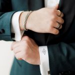 “It’s easy to get swept up in the craziness of your wedding day, but remember to slow down, take it all in, and have fun,” says Ethan. Even the rain helped create a cozy atmosphere for the 100 guests in the carriage house—with raindrops tapping the window and clouds casting a soft light on the wood-paneled walls.