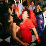 They were drawn to the retro ’70s disco trend but wanted to do a slight twist, so they settled on “modern art disco” for the motif. That meant incorporating elements of surrealism into the décor, with handmade melted disco balls, a boom box exploding with flowers, and a giant silver balloon installation over the dance floor.