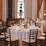 Wedding Design Inspiration We wanted our wedding to have an elegant and timeless feel. The ornate architecture at The Belvedere was the perfect backdrop for the affair. The groomsmen wore classic tuxedos and the bridesmaids all wore different champagne-colored dresses. Muted shades of ivory and mauve were chosen for the bouquets. The head table was strewn with a long green garland, mercury glass tea lights, and copper accents in the form of agate slice place cards and wax seals on the dinner menus. Our wedding invitations incorporated copper and forest green tones with an illustration of The Belvedere.