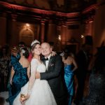 Favorite Details Champagne girl greeting guests at the reception, wearing a caged ball gown with champagne flutes attached. Cigar roller with custom labels, a surprise musical dance number by hotel bellhops. Dessert: gelato, donuts, speciality coffees and espresso martinis. Extravagant cascading flowers everywhere. Floating candles in the hall. Dinner tables had cherubs, fresh fruit and vegetables and candelabras-as would be seen as a King’s feast. Bridesmaids all wore different floral accessories instead of holding bouquets. They ranged from a fan, a purse, shoes, earrings, hair pieces, belt and more. No two were the same.