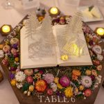 - Brian built our wedding arch and the wooden bases for our centerpieces, into which he hand carved the table numbers. We also made the centerpieces themselves, which were pop-up book art displays representing moments from our relationship like getting engaged during Christmas, going on camping trips together, buying our first house, etc. We included a blurb on the back of the dinner place cards that explained the scene and included a QR code to view a photo album with our pictures from those moments. We had a lot of customized décor, but the wedding arch and the centerpieces were our standouts. They made our wedding feel incredibly special and personal, our guests loved walking around and looking at our centerpieces, and we now have amazing sentimental pieces to include in our home décor.