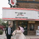 They wanted the wedding to also reflect their personalities. Emily had performed and attended events at Creative Alliance in Highlandtown many times over the years and loved how community-oriented the arts organization was and how much it supported its artists. So she and Dan agreed it would be the perfect setting for their big day. “On an aesthetic level, I love the little details of the Black Box Theatre, like the wooden panels and the greenish-gold curtains. The Marquee Lounge is so beautiful, we didn’t decorate it at all,” Emily says. “Getting to customize the marquee on the building was also a really special touch.”