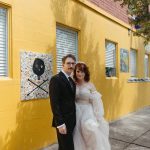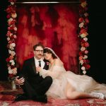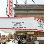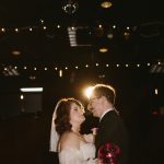 They wanted the wedding to also reflect their personalities. Emily had performed and attended events at Creative Alliance in Highlandtown many times over the years and loved how community-oriented the arts organization was and how much it supported its artists. So she and Dan agreed it would be the perfect setting for their big day. “On an aesthetic level, I love the little details of the Black Box Theatre, like the wooden panels and the greenish-gold curtains. The Marquee Lounge is so beautiful, we didn’t decorate it at all,” Emily says. “Getting to customize the marquee on the building was also a really special touch.”