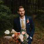 So, no one was surprised when their wedding theme became “Foxes & Ferns,” with Kaylyn, an artist and house manager for events at the Baltimore Museum of Art, creating a family crest that portrayed their initials, their dogs Lola and Cora, and, of course, a fox and a fern. One revelation for the guests, including Kaylyn and Thomas, was a bagpiper. “My father surprised us by hiring a bagpiper,” says Kaylyn. “Being a Scot, he wanted to keep the traditions of his ancestors alive at our wedding.” The whole wedding felt special and personal. Their venue, Emory Grove Hotel, was built in 1868 and is just through the woods from Kaylyn and Thomas’ home. It felt intimately connected to their relationship. Because of her job and passion for visual arts, Kaylyn took on the role of wedding planner. “It was definitely a lot and very stressful at times,” she says of the task. That included sourcing 150 plates for the reception. “Each one I hand-selected while thrifting for 10 straight months before the wedding.” She also collected 100 bottles and about eight deer skulls for the florist, Thurman & Fig, to play with. Other elements included fox ties for the groomsmen purchased at the BMA gift shop, mismatched rich fall colors of the bridesmaids’ velvet gowns, and Kaylyn’s hand-drawn invitations that included portraits of Thomas, the dogs, and their ceremony venue, Sacred Heart Little Church. It’s easy to get lost in the details, says Kaylyn. But “remember why you are getting married—the planning process can be stressful, but taking the time to reflect on how much you love each other goes a long way,” she says. “It was a special sentiment that made us realize everything is okay and we are here. We made it.”