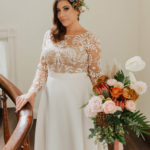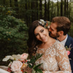 So, no one was surprised when their wedding theme became “Foxes & Ferns,” with Kaylyn, an artist and house manager for events at the Baltimore Museum of Art, creating a family crest that portrayed their initials, their dogs Lola and Cora, and, of course, a fox and a fern. One revelation for the guests, including Kaylyn and Thomas, was a bagpiper. “My father surprised us by hiring a bagpiper,” says Kaylyn. “Being a Scot, he wanted to keep the traditions of his ancestors alive at our wedding.” The whole wedding felt special and personal. Their venue, Emory Grove Hotel, was built in 1868 and is just through the woods from Kaylyn and Thomas’ home. It felt intimately connected to their relationship. Because of her job and passion for visual arts, Kaylyn took on the role of wedding planner. “It was definitely a lot and very stressful at times,” she says of the task. That included sourcing 150 plates for the reception. “Each one I hand-selected while thrifting for 10 straight months before the wedding.” She also collected 100 bottles and about eight deer skulls for the florist, Thurman & Fig, to play with. Other elements included fox ties for the groomsmen purchased at the BMA gift shop, mismatched rich fall colors of the bridesmaids’ velvet gowns, and Kaylyn’s hand-drawn invitations that included portraits of Thomas, the dogs, and their ceremony venue, Sacred Heart Little Church. It’s easy to get lost in the details, says Kaylyn. But “remember why you are getting married—the planning process can be stressful, but taking the time to reflect on how much you love each other goes a long way,” she says. “It was a special sentiment that made us realize everything is okay and we are here. We made it.”