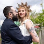 Beauty Bridal hair cut/color by Josh Powell of Cultivate Salon and day-of-styling by Danielle of Fringe Caterer Ekiben Cupcakes Codetta Bakes Floral Design Pom pom flowers crafted by Harris and their bridespeople Honeymoon Japan Invitations Designed by Miles and Harris Location The Garage at R House Music Trillnatured Officiant Marissa Lanterman Photographers Ana Tantaros of Side A Photography and Taylor Mihaljevic of Taylor Ann Photography Wedding Outfits White jumpsuit by Anthropologie and black jumpsuit by Zhivago; shoes by Kurt Geiger and Betsey Johnson, and green gloves by Fashion Brand Co. The groom’s suit was Indochino, shirt Descendant of Thieves, glasses by Theo, shoes by Dr. Martens, and belt by Carhartt. Bolo ties for all groom’s people and the groom by Stellarium Jewelry and Sailor Scout bridal party wands by Pullen3DPrinting on Etsy. Wedding Planner Bashan McLeod of EventBay