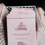 Margaret knew that she didn’t want to use trendy brush script, and that everything had to feel like one cohesive experience. She spent hours picking out fonts, a color palette (that was less of a strict color palette, and more of a color vibe), and designing a custom logo. Everything that was used for the wedding Margaret designed and made. The wedding initiations and stationary suite included a custom repeat pattern inspired by toile patterns including illustrations of the different wedding venues, crabs (because it felt so perfect for a Maryland wedding), and the monument in Mount Vernon. Other elements included fabricated signage that she made using tools and a laser cutter for letters, table numbers made from marble tiles, menus that were laser cut with their wedding logo, custom stir sticks (yes, also laser cut by Margaret), and of course, laser cut name cards for each guest with different colors indicating the entrée choice instead of settling for stickers. The flowers and bouquets were made by Margaret, her mother-in-law, maid of honor, and sister-in-law two days before the wedding.