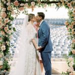 As they moved on to planning their wedding, Bridie and Joe picked Merriweather Post Pavilion as their venue. “It’s a meaningful location for us,” says Bridie. Joe’s family is in the music business—I.M.P. Productions—and they book shows at Merriweather. “Joe has grown up with music and gone to concerts his whole life,” says Bridie. “It just seemed like a fitting location.” Their wedding date also coincided with the statewide mask mandate being lifted. “Our wedding day truly felt like the beginning of life returning back to normal,” she says. “For many of us, it was the first time being in a larger crowd again and everyone was just so happy.” That joy was reflected in the wedding day, as well: sweet springtime pastels for the décor and a ton of florals for the outdoor ceremony and reception. “We wanted it to feel easy, soft, pretty, and fit in with the spring season,” she says. “It was truly a whimsical, Taylor Swift/Bridgerton feel—perfect for a beautiful spring day at Merriweather.” And, adds Bridie with a laugh, “the cicadas stayed underground.”