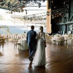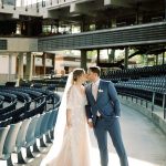 Wedding guests enjoyed cocktail hour on the VIP deck while the stage was flipped from ceremony to reception. They sipped rosé, slurped oysters, and wore VIP concert-style passes that also told their assigned table for dinner. The “pit” directly in front of the stage was filled with couches, games (giant Jenga and cornhole), and loads of Polaroid cameras. The afterparty—more music and late-night food—was held by the (secret) pool backstage normally reserved for musicians rolling through on tours.