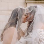 As guests were making their way to the reception, Rachel and Michelle snuck away for some alone time. “We took 15 minutes after the ceremony to enjoy our first moments as newlyweds,” says Rachel. They also used the time to change into more comfortable footwear. Rachel always wears Superstars and Michelle always wears Stan Smiths, so it was fitting to each get a fresh pair of sneakers with gold accents to complement the venue and each other.
