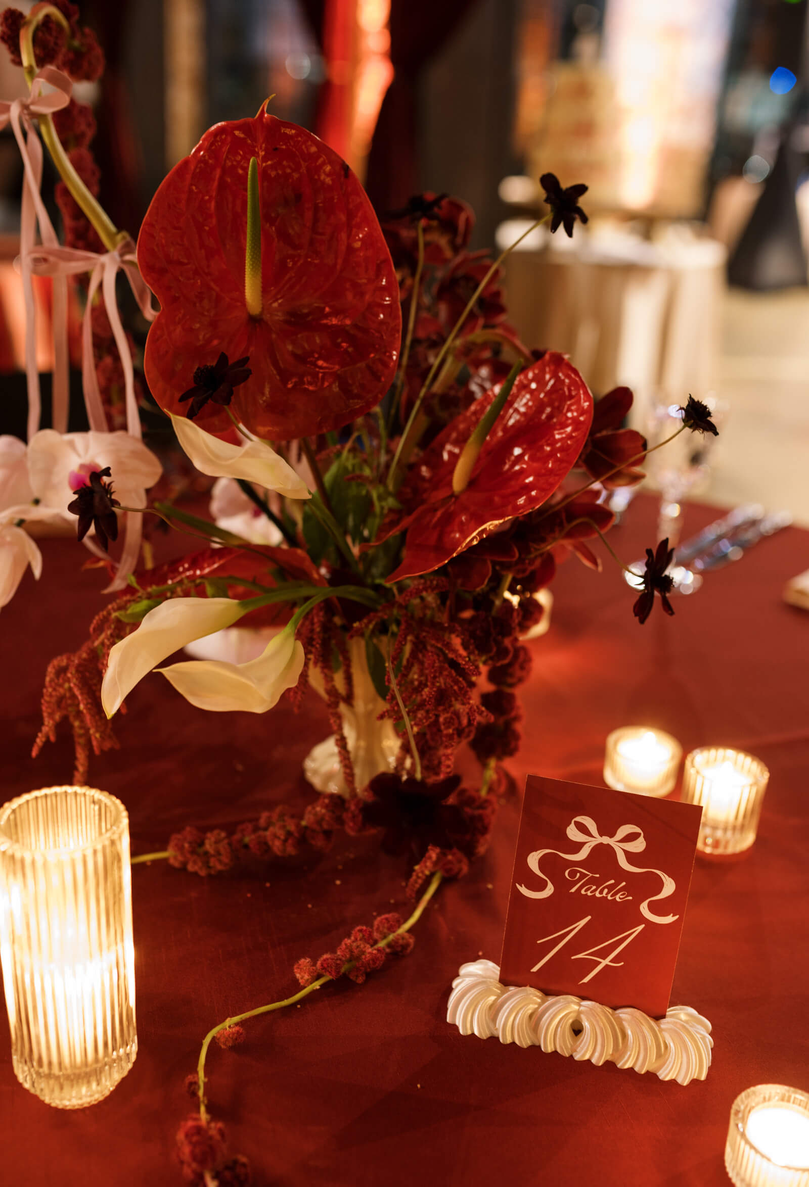 Wedding Design Inspiration The vision came into play once Sarah found her dress. Knowing we’d be married in winter; we wanted decor and florals to be reflective of the season aka anything but light summery. The aesthetic was Roccoco in red.