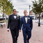 Wedding Design Inspiration We were really inspired by the city of Baltimore and showing off our home that we love. For the ceremony, we love Mt Vernon and have spent a lot of time there as the historic center of the gay community in Baltimore. Our groomspeople all wore colors from the pride flag, each symbolizing an important aspect of queer life. Naturally, we needed a parade to lead us to the next venue afterward! For the reception, we showcased some Baltimore images from local artists including Charlie Barton, Kelly Walker, & Shawn Theron and took advantage of the exposed graffitied brick walls in our venue. On the dance floor, we framed our favorite vinyl album art to set a disco-y mood. We also wanted a more formal party with a 1920s/30s Art Deco feel with strong clean lines. Copper accents and homemade gourd centerpieces played up our autumn feel in Baltimore.