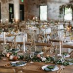 Beauty Alex Kasey Studios (hair); Chrissy Forbes (makeup) Bistro Lighting & Drapery Event Solutions Bridesmaids Revelry (Skye satin dress in Blush, Rosalie tulle convertible dress in Greenery, and Maeve tulle dress in Bradshaw Blush) and Jenny Yoo (Dahlia Palermo satin dress in Sage) Cake Copper Kitchen (with florals by Mya Frey) Caterer Copper Kitchen Cocktail Furniture Pretty Little Wedding Co. Flatware, Dinnerware & Linens Select Event Rentals Floral Design Mya Frey Flowers Groom and Groomsmen BLACK By Vera Wang Black Notch Lapel Tux Hotel Hotel Indigo Downtown Baltimore Invitations Minted “The Wedding” by Kaydi Bishop Location Mt. Washington Mill Dye House Music DJ Bedro Officiant Pastor Ryan Cox with Severn Covenant Church Photographer Mary Bell Wedding Outfits Morilee #2406 dress from J&B Bridals in Chambersburg, PA (ceremony); Club L London “Sing To Sleep” white maternity one-shoulder cape jumpsuit (reception)