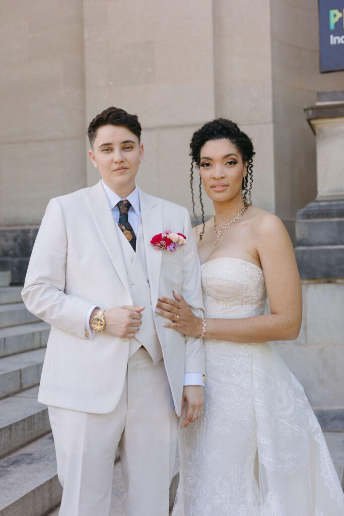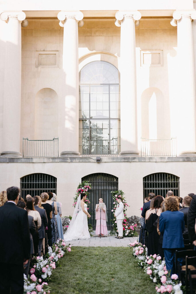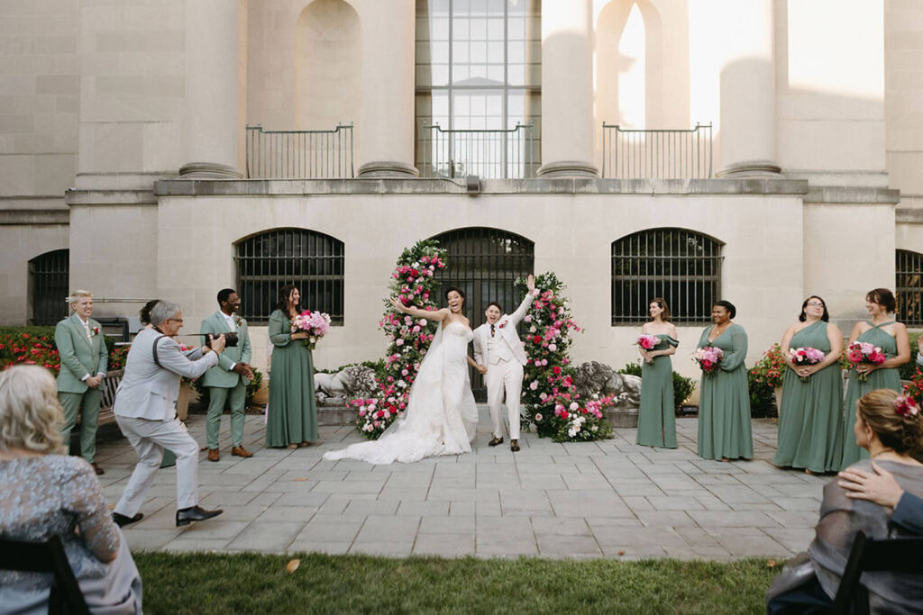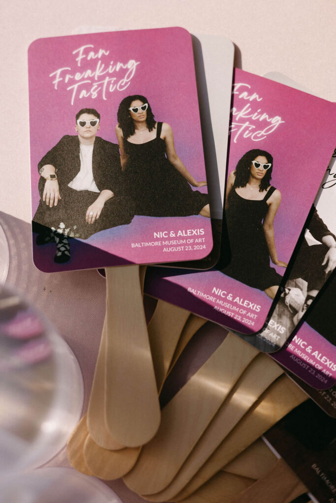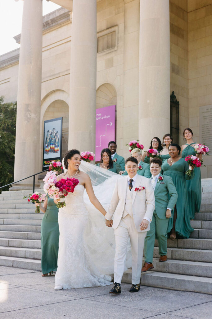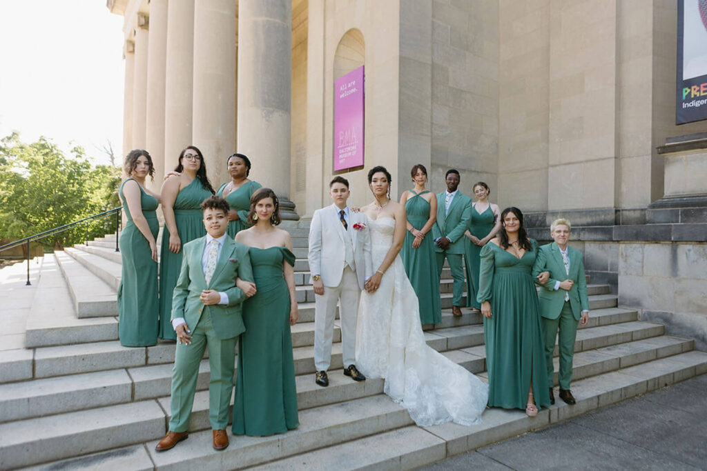 BEAUTY Guidugli Artistry BRIDESMAIDS Azazie CAKE & CATERER Zeffert & Gold FLORAL DESIGN We Do Event Design INVITATIONS Minted LOCATION Baltimore Museum of Art MUSIC Apollo String Quartet, Bachelor Boys Band OFFICIANT Deirdre Wade, a dear friend of ours PHOTOGRAPHER Sarah James Photography WEDDING COORDINATOR We Do Event Design WEDDING OUTFITS Alexis: Lazaro gown, jewelry, and veil from Castle Couture Bridal in New Jersey; and after-party Giselle jumpsuit from Abercrombie & Fitch. Nic: 9 Tailors Boston suit and Taft shoes. WEDDING PARTY Abitto suits