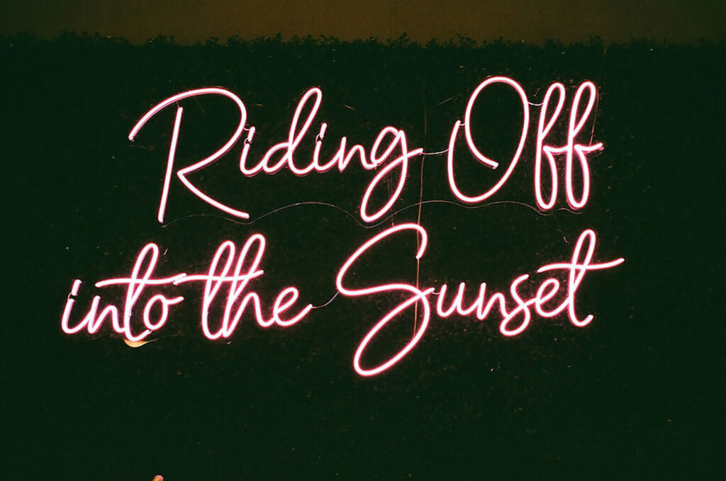 Favorite Details We had a life size carousel horse that was engineered to be sittable as a photo prop against our grass backdrop that had a neon sign saying, “Riding Off Into the Sunset.”