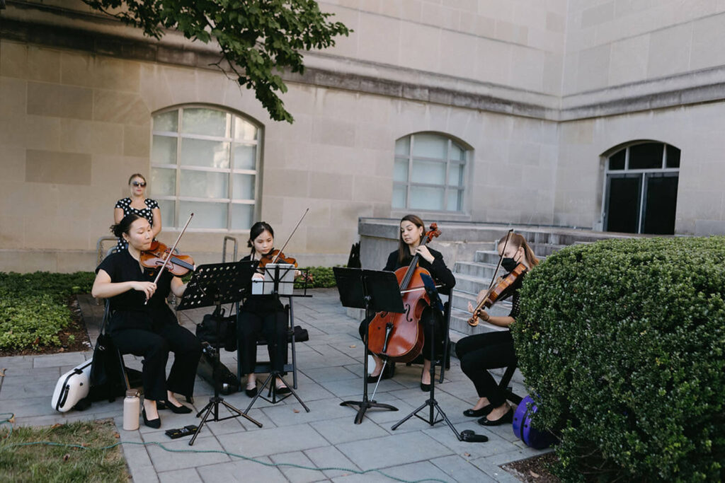 What Was Unique and Special About Your Wedding Day We had live music throughout the entire event that moved chronologically through musical time period throughout the day. The ceremony and cocktail hour, played by spring quartet, started with baroque music (1600-1750), progressing to late romantic era classical music (late 1800s) and then switching the string quartet pop music covers. Then for the reception, we had a wedding band that played everything from Earth Wind and Fire to ABBA to Chappell Roan.