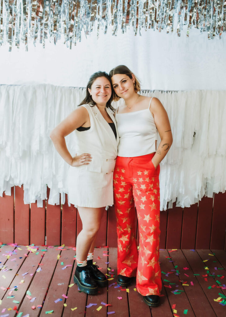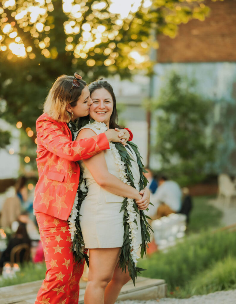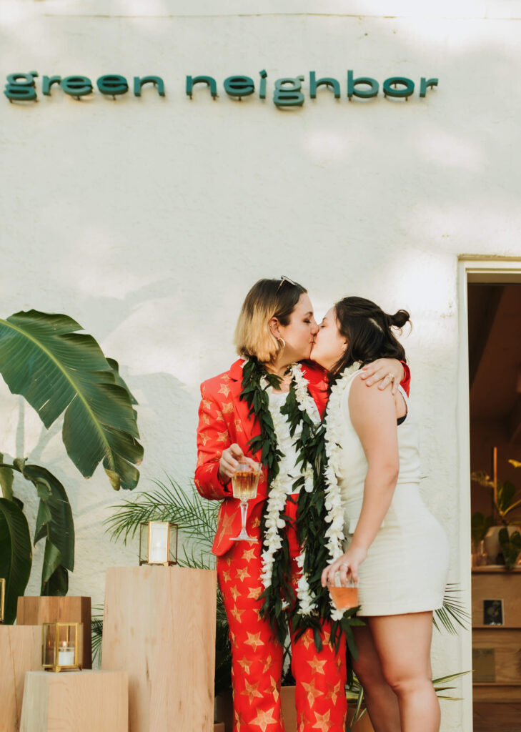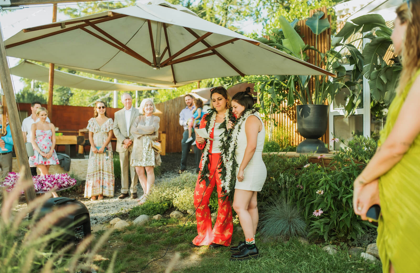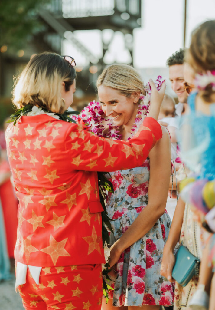 DESSERT Taharka Brothers ice cream truck CATERER Mera Kitchen FLORAL DESIGN Edge Floral Event Designers and The Hawai’i Lei Stand HONEYMOON Scotland INVITATIONS Paperless Post LOCATION Our house and Good Neighbor MUSIC Spotify playlists made by Olivia and her sister Shannon OFFICIANT Alex Hirshberg for the ceremony and Shannon Boyle for the Hawaiian lei ceremony PHOTOGRAPHER Kimberly Dean Photography TRANSPORTATION Thoroughbred shuttles WEDDING OUTFITS Olivia wore a red suit from Any Old Iron and Danielle wore an off-white romper from a thrift store. Both of us wore Doc Marten oxfords. WEDDING PLANNER The Otherside Creatives
