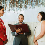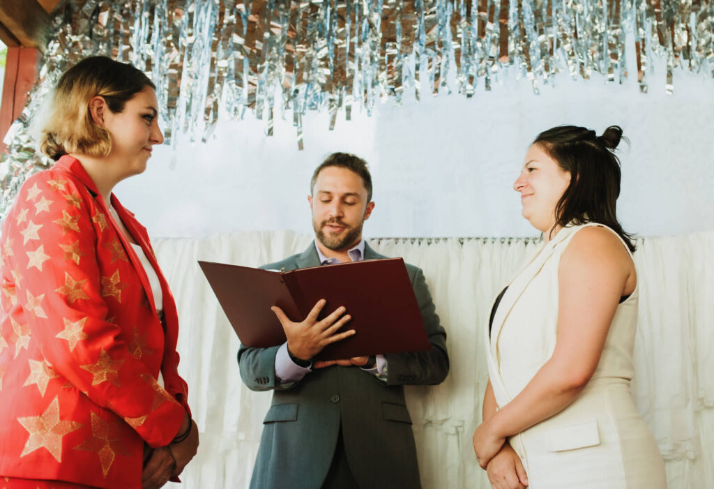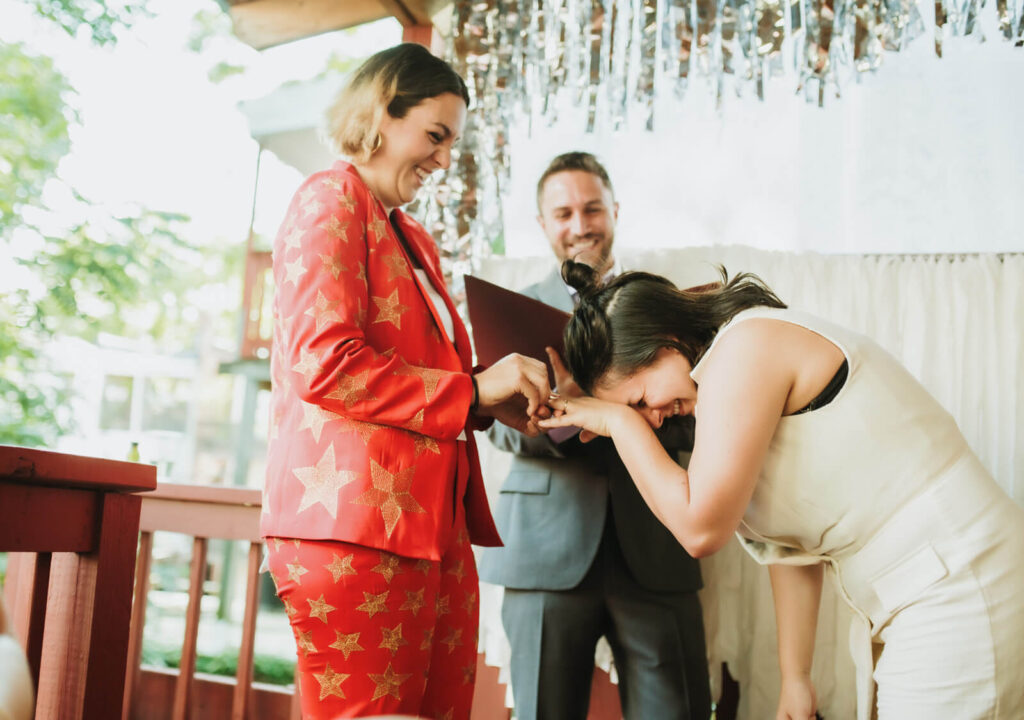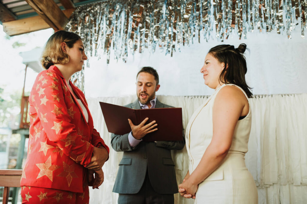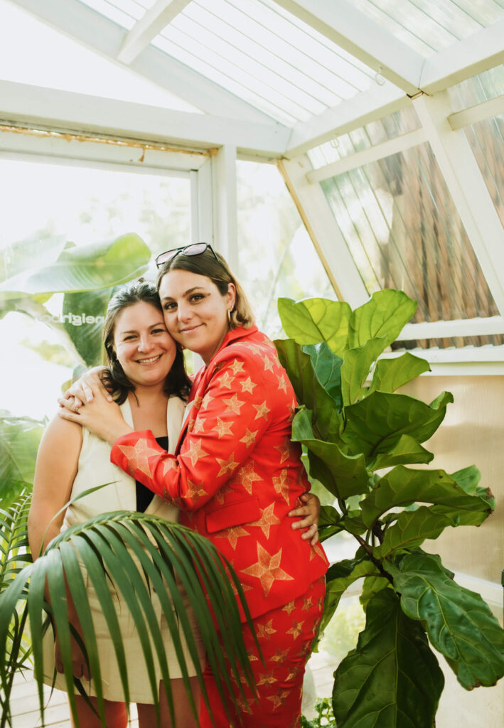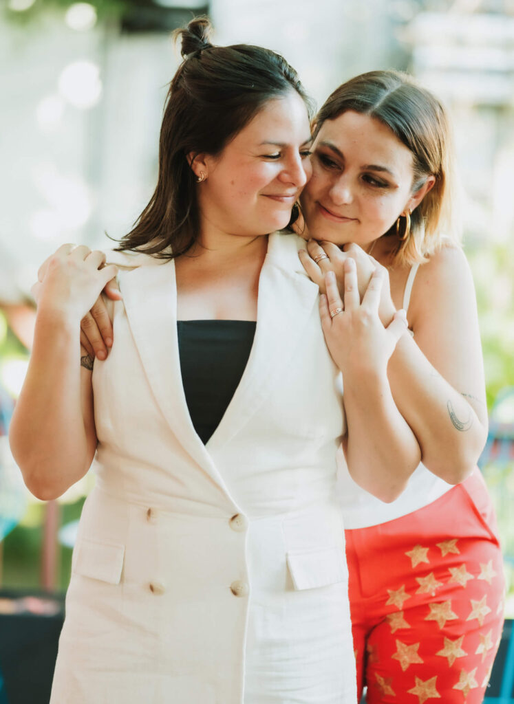 DESSERT Taharka Brothers ice cream truck CATERER Mera Kitchen FLORAL DESIGN Edge Floral Event Designers and The Hawai’i Lei Stand HONEYMOON Scotland INVITATIONS Paperless Post LOCATION Our house and Good Neighbor MUSIC Spotify playlists made by Olivia and her sister Shannon OFFICIANT Alex Hirshberg for the ceremony and Shannon Boyle for the Hawaiian lei ceremony PHOTOGRAPHER Kimberly Dean Photography TRANSPORTATION Thoroughbred shuttles WEDDING OUTFITS Olivia wore a red suit from Any Old Iron and Danielle wore an off-white romper from a thrift store. Both of us wore Doc Marten oxfords. WEDDING PLANNER The Otherside Creatives