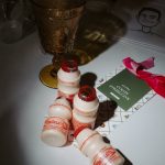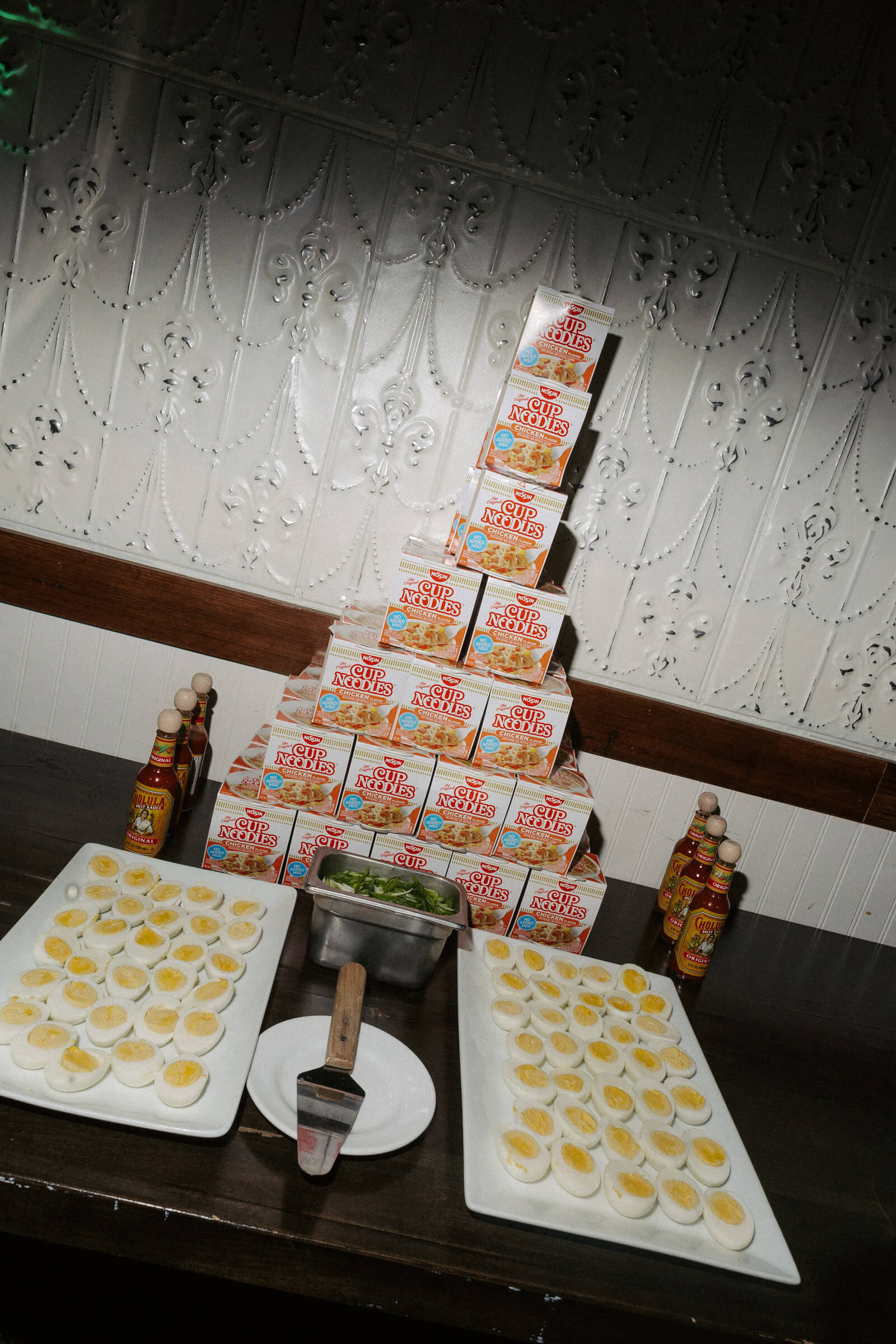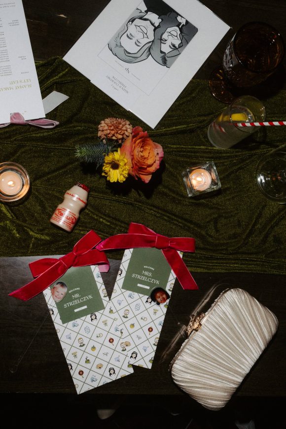 “I wanted there to be a lot of color, texture, and depth, and for all of the elements to showcase our fun personalities,” says Priscilla. “I’m a branded environment designer, so I wanted the day to feel like a multi-layered experience full of personalization.” That meant lots of details that felt exclusively like them as a couple. “We had a surprise ring bearer, where we had someone hide our wedding bands underneath a random seat,” laughs Priscilla. “Everyone was so excited to check under their seats to see if they had it. It ended up being my cousin, who is actually the first family member of mine that Nathan was able to meet because of COVID travel restrictions. It couldn’t have been a better person.” Priscilla also designed Old Bay-inspired T-shirts that they tossed out to their guests on the dance floor. “We love games and some friendly competition, so it was fun to see our guests battle it out for some T-shirts,” she says. “A lot of people changed into them as the night went on and wore them to our after-party.” And the night ended with a late-night ramen snack bar—Priscilla’s favorite. There were also caricatures of all the guests, a Blades of Glory fire and ice dance, and an after-dinner toast with Yakult, a probiotic beverage that Priscilla grew up drinking (her family is Indonesian). The original supermarket they were working with forgot to place the order, but the day before the wedding, Nathan, a financial analyst, drove to H Mart and found enough bottles. “He saved the day.”
