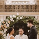 The two quickly settled on the George Peabody Library as their venue. “Our parents would love to say that we met at the library and not at a bar,” jokes Margi. “But at least we got married in one.” As their wedding planning progressed, Margi and James focused on four key words: connection, intimacy, texture, and greenery. Connection for Margi meant incorporating wedding traditions from her Filipino heritage into the ceremony and involving all of their younger siblings. Their bridal party included James’ three sisters and Margi’s three brothers, affectionately dubbed “bridesmen” and “groomsmaids.” And perhaps the biggest connection—Margi served as a flower girl in the same spot 25 years earlier for her aunt and uncle’s wedding. (Her uncle even planned a small, surprise vow renewal for her aunt towards the end of the night.) And while the Peabody, with its soaring ceilings and 300,000 tomes, would never be described as “intimate,” it was important for the couple to stick to their vision. “I really wanted a wedding that juxtaposed the grandeur of the Peabody with the texture of a small garden,” says Margi. That meant an aisle lined with loose, overgrown greens, a beautiful arbor draped with flowers, and a cake that positively bloomed.