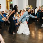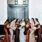 The wedding was also very them, with a cozy, jazz-club vibe, including a cigar lounge. They focused on accessories like candles, mismatched glassware, and table linens. The six bridesmaids wore various shades of nude, and that idea extended to the vendors, with occasional pops of black and green. “We worked extremely hard on ensuring every aspect of our wedding day expressed us, or tied into our relationship in some way,” says Robert. That included a caricature station at the reception, one of Karimah and Robert’s favorite things. “We even included original caricatures of us that were drawn during our first year of college—they are as old as our friendship and even older than our relationship,” he says.