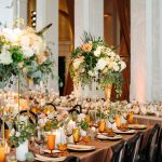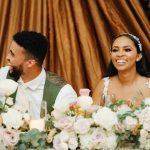 The wedding was also very them, with a cozy, jazz-club vibe, including a cigar lounge. They focused on accessories like candles, mismatched glassware, and table linens. The six bridesmaids wore various shades of nude, and that idea extended to the vendors, with occasional pops of black and green. “We worked extremely hard on ensuring every aspect of our wedding day expressed us, or tied into our relationship in some way,” says Robert. That included a caricature station at the reception, one of Karimah and Robert’s favorite things. “We even included original caricatures of us that were drawn during our first year of college—they are as old as our friendship and even older than our relationship,” he says.