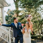 Their first date was dinner and ice skating. “I was absolutely terrible, so it made for lots of laughs and being ourselves,” she says. Her immediate sense of ease around Nate came as a surprise to Lauryn, who can be guarded as she gets to know someone. As he dropped her off that night, he asked if she had left anything in his car. “Just my heart,” she told him, joking but not. And it turned out to be the truth. After a proposal in Pittsburgh (what can we say, Nate is a Steelers fan), they knew they wanted a wedding that was romantic and sentimental—but closer to their hometown. “We wanted it to feel like a casual garden party,” says Lauryn, so they featured twinkle lights, long family-style tables, garland, and mismatched candlesticks. Seasons at Magnolia Manor in New Windsor felt modern, but with a place in history. (The uneven brick pavers by the front steps are original from when Theodore Roosevelt gave a stump speech there while campaigning against William Howard Taft in 1912.) Even though a lawn mower revved up right as they were exchanging vows and a guest’s cell phone rang out, “we loved every minute of our ceremony and continue to laugh at all the imperfect moments,” says Lauryn.